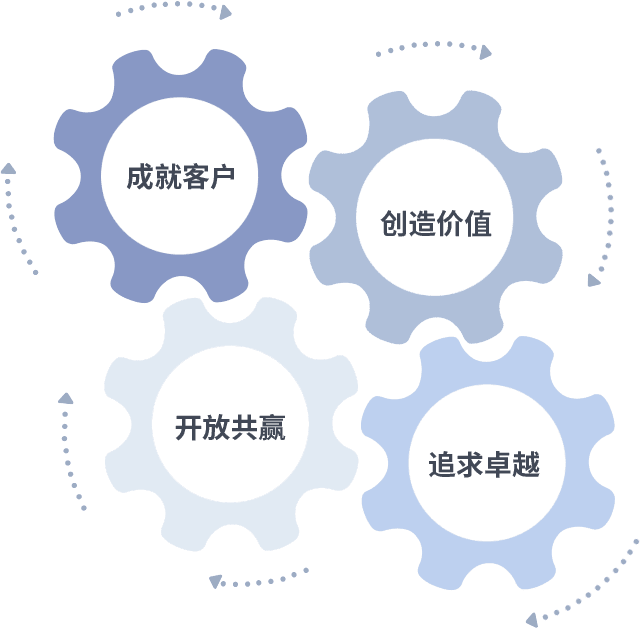 成就客户是一切决策的出发点,,,创造价值是衡量所有工作的标准,,追求卓越是我们做事做人的态度,,,,开放共赢是我们的格局也是最终的结果。。。价值观的齿轮环环相扣,,,,推动着组织里的每个人不断向前。。。。